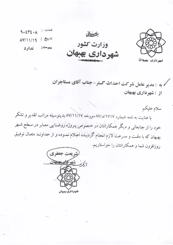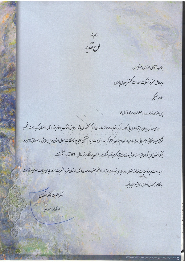 - مدیر دفترفنی واجرایی شرکت بعنوان بهترین مدیر اجرایی استان اصفهان از طرف خانه صنعت، معدن و جوانان اصفهان