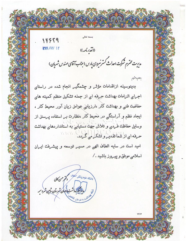- مدیر تولید شرکت بعنوان بهترین مدیر تولید جوان استان اصفهان از طرفخانه صنعت، معدن و جوانان اصفهان