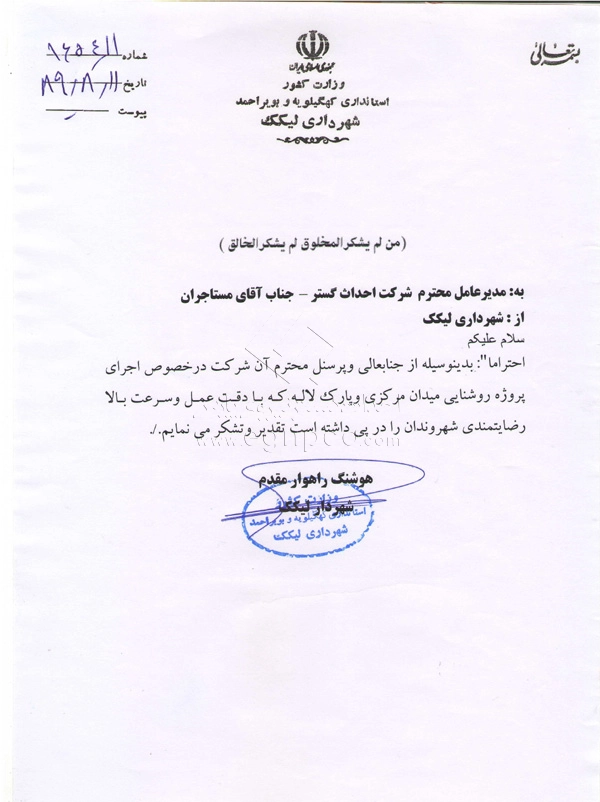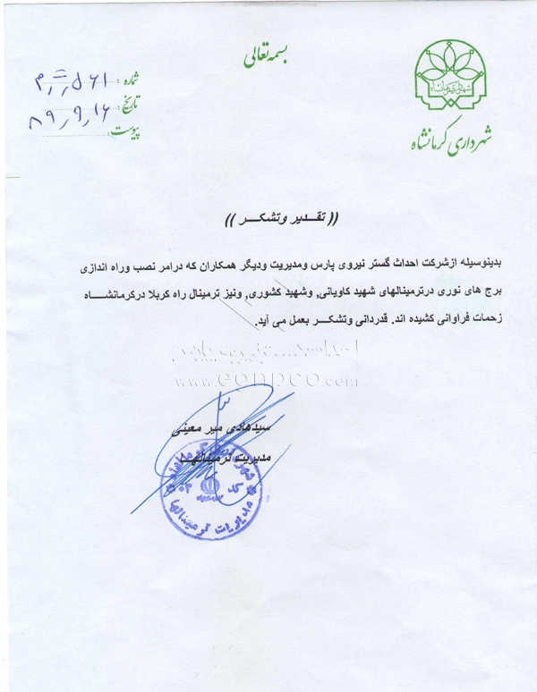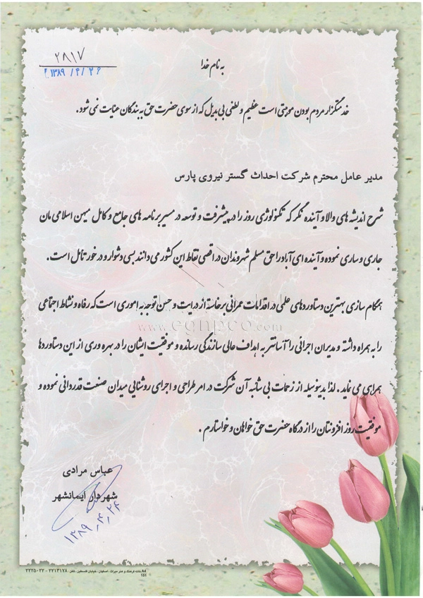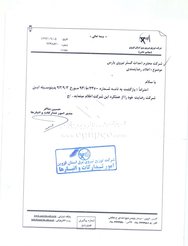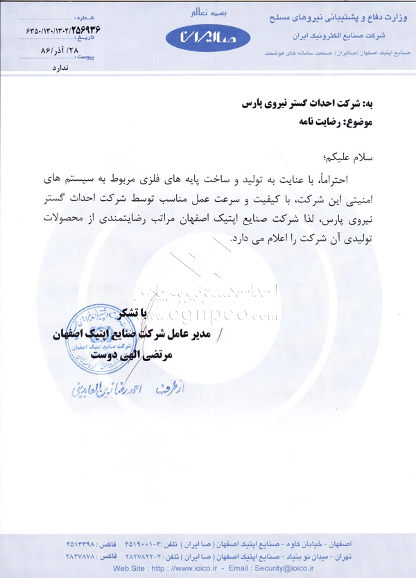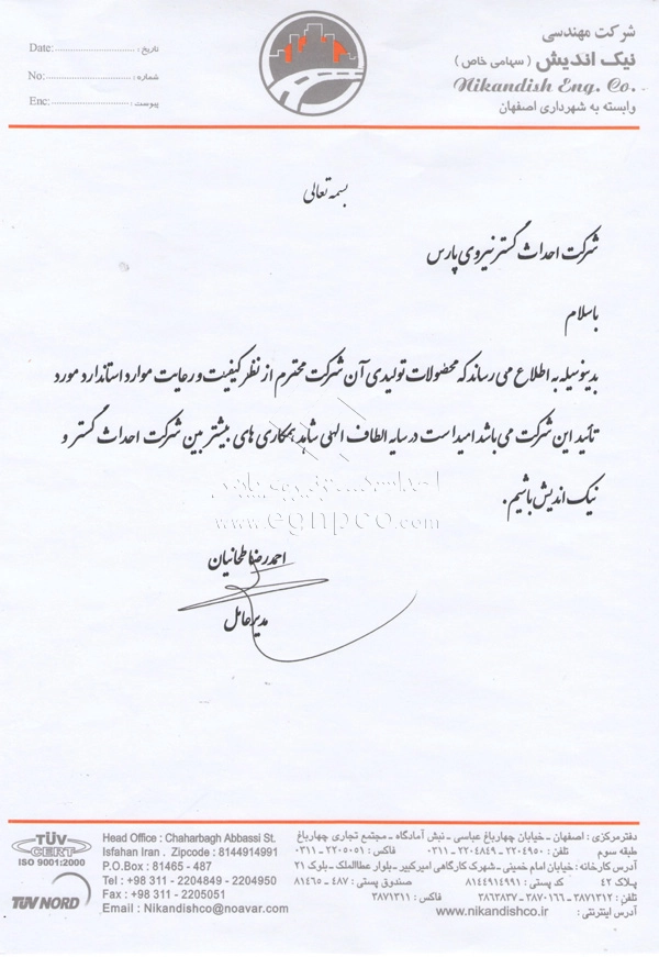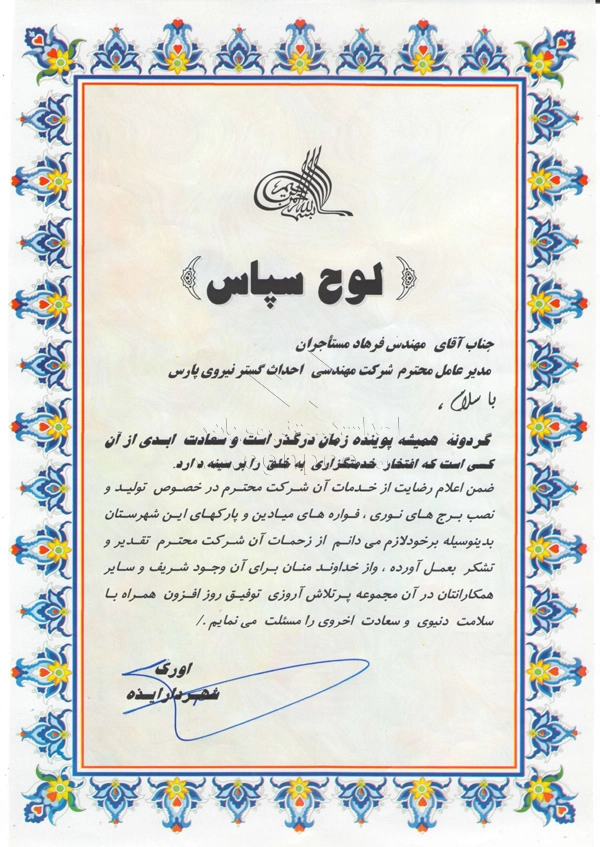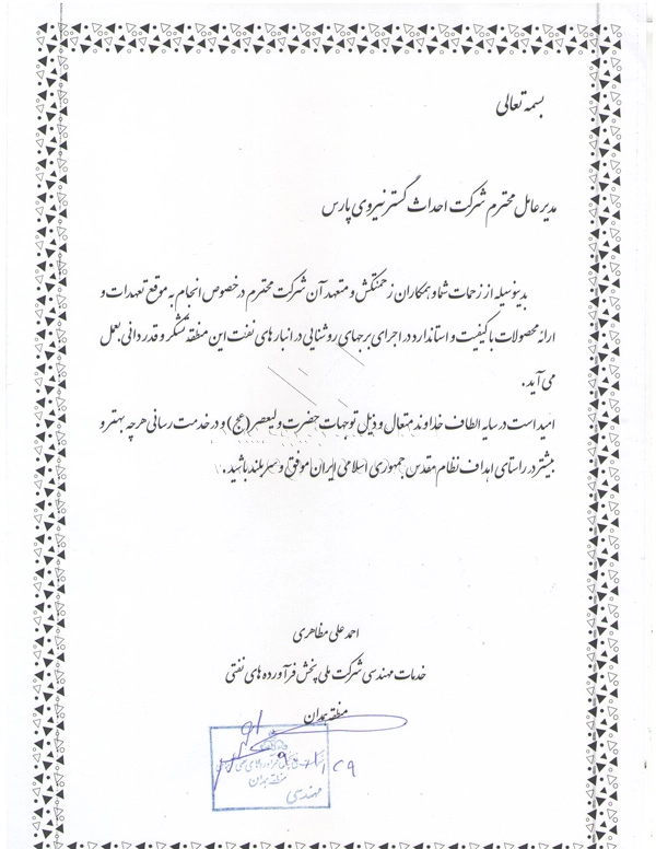 در جهان امروز لازمه پیشرفت و توسعه ، داشتن روابط متقابل با سایر شرکت ها و سازمان ها می باشد در این راستا شرکت مهندسی احداث گستر نیروی پارس با توجه به سیاست مدیریتی خود مبنی بر کسب اعتماد و رضایت مشتری توانسته است با ارائه محصولات و خدمات خود (طراحی ، ساخت و اجرای پایه چراغ خیابانی و پارکی، برج نوری ( روشنایی) ، دکل های استادیومی ، دکل های پرچم ، پایه های ترافیکی و سایر محصولات ) در نهایت دقت و کیفیت تاییدیه های ذیل را کسب نماید.